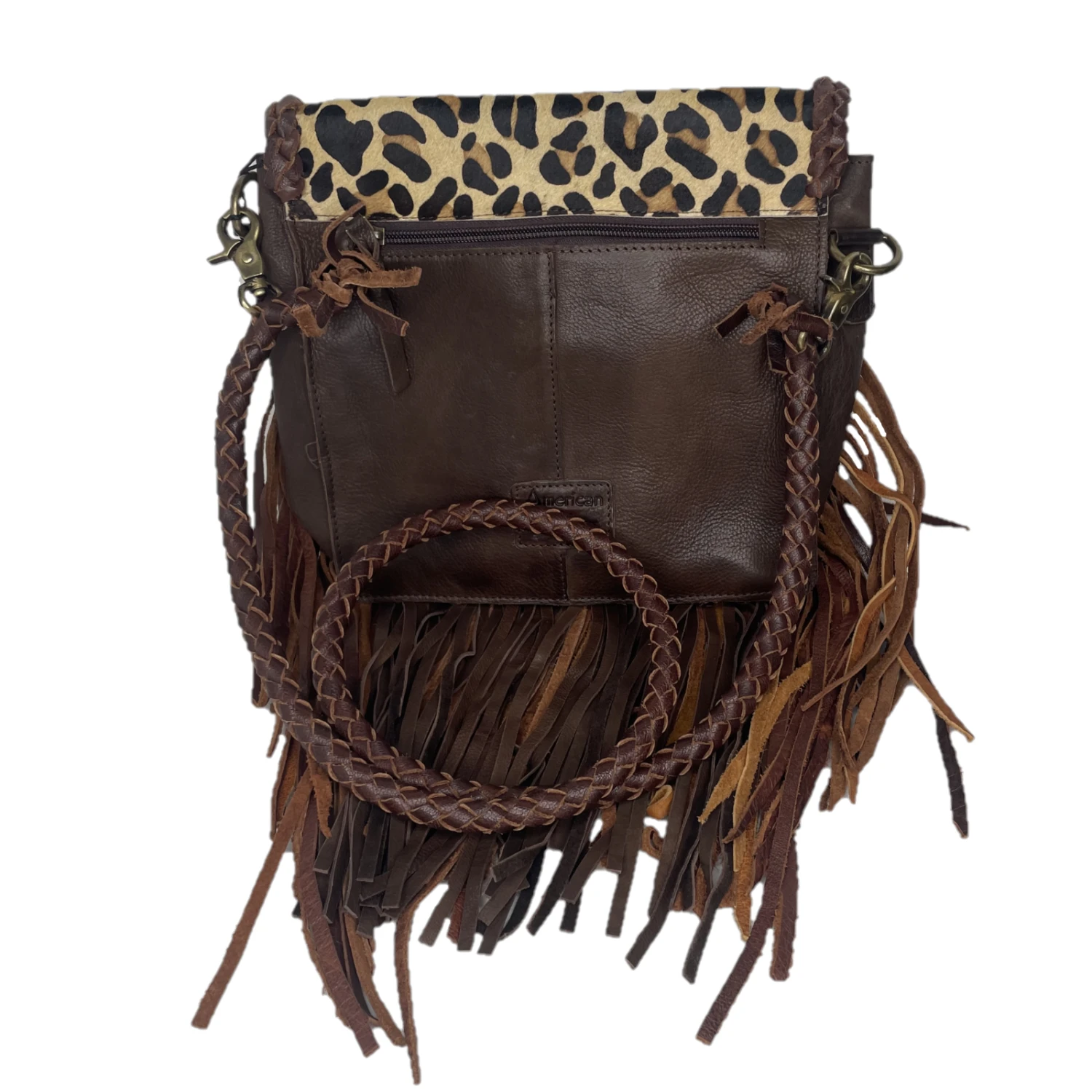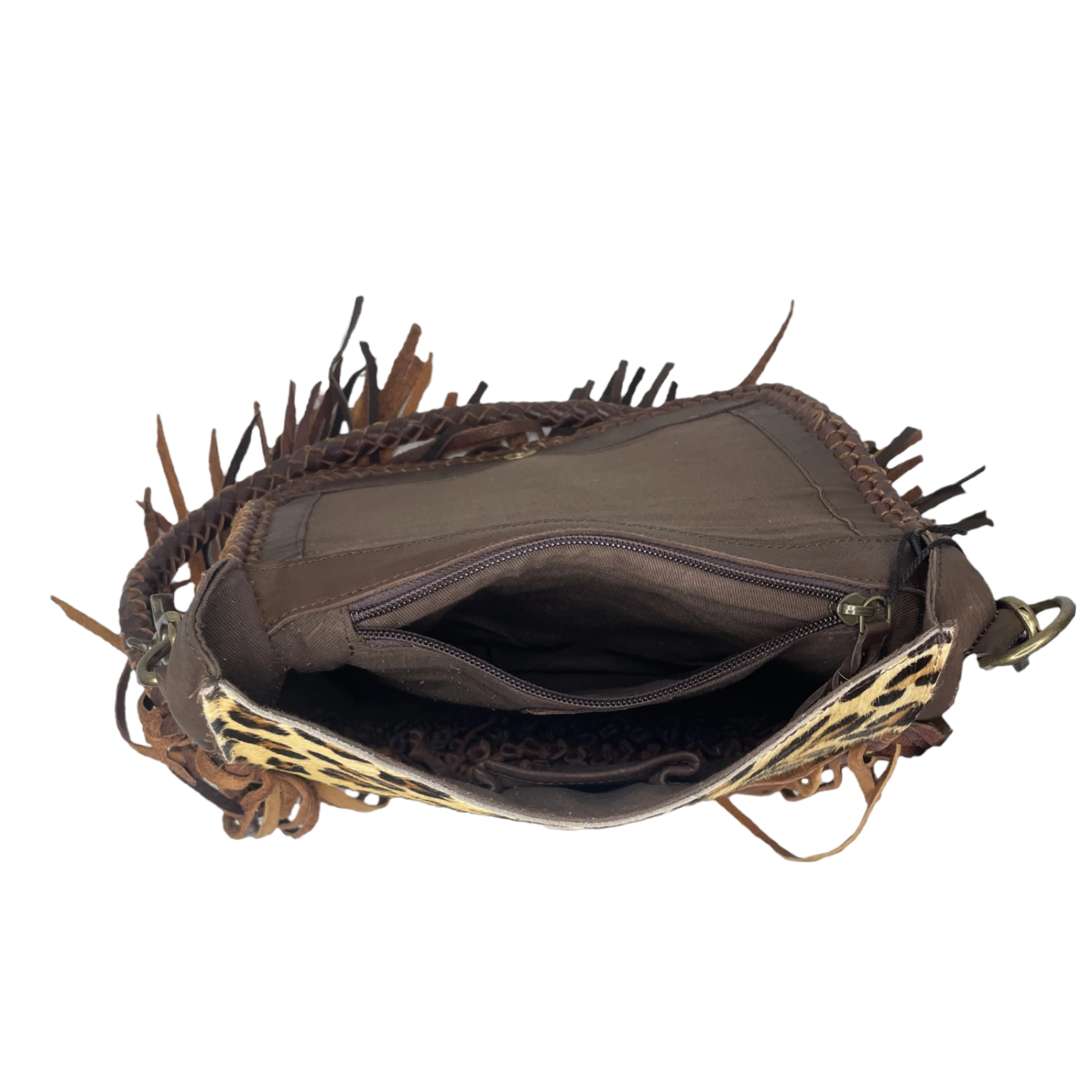 - Leather brown fringe design throughout.