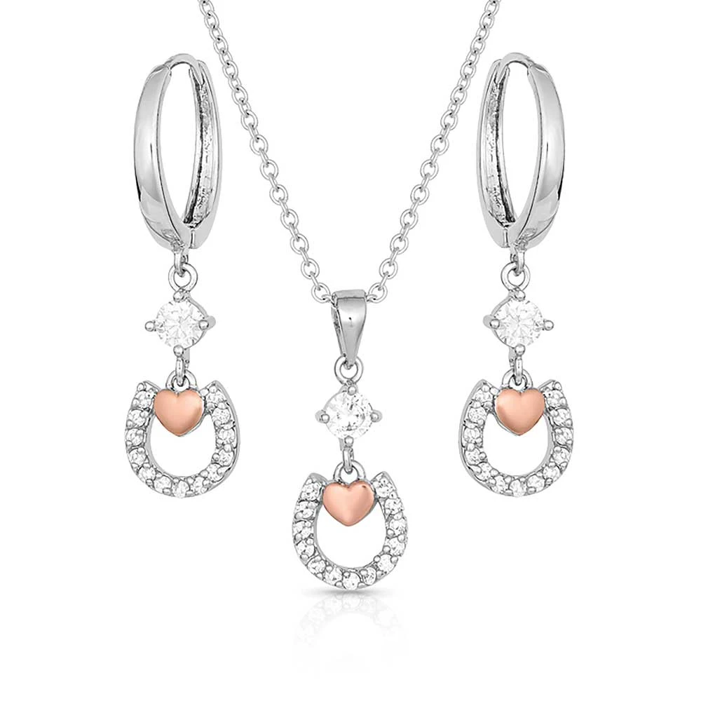 - A charmingly sweet horseshoe jewelry set with a heart and horseshoe design